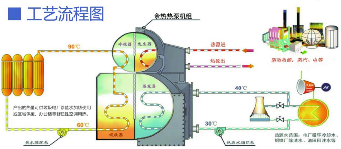 高效节能:余热利用系统能够有效地利用低位热能,通过蒸汽或电力驱动,将低位热能转化为高位热能,从而实现高效节能的效果。