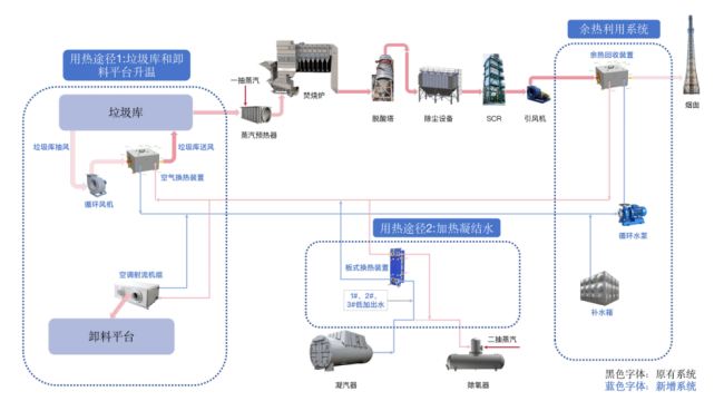 根据垃圾焚烧电厂的用热需求,可将回收的余热用于加热凝结水,提高除氧器进水温度,降低除氧器对蒸汽的消耗,可为企业节省大量的蒸汽,也可用于加热焚烧炉一次风,提高焚烧炉的进风温度,减少新蒸汽的消耗,节约的蒸汽可用于发电或供热,提高企业的经济效益。另外,采暖季时,回收的余热通过空气换热装置可为垃圾库升温使用,提高垃圾库环境温度,减少垃圾发酵时间,提高垃圾处理效率。同时,回收的余热可以通过射流机组供卸料平台采暖使用或用于加热锅炉补水、供热、洗浴、制冷等。