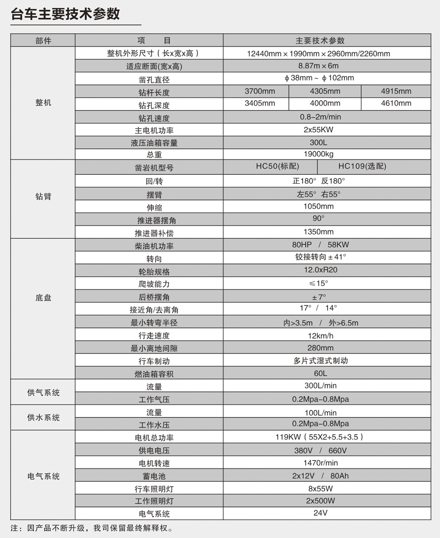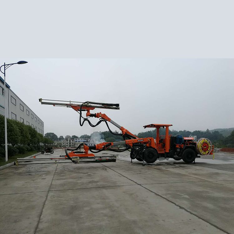 DW2-50型掘进台车适用于断面(宽×高)8.87m×6.0m,爬坡能力≤15°,行走速度可达12km/h;设备应用于地下矿山、水电、铁路、公路等领域的巷道,隧道掘进时所需爆破孔和锚杆孔作业。